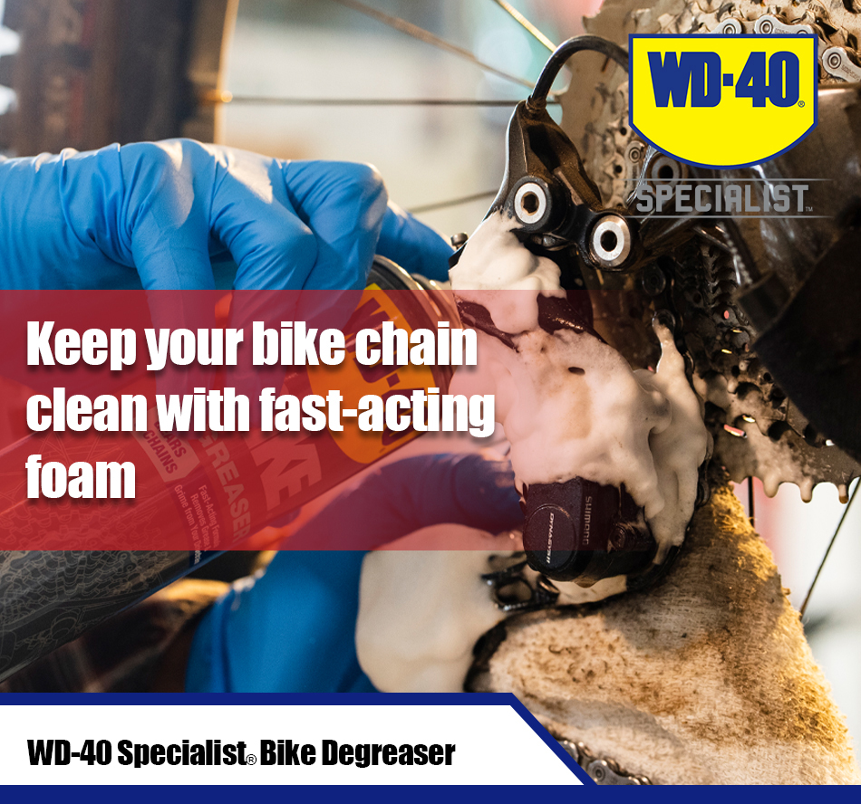 WD-40 Specialist® Bike Degreaser foaming action clings to chain, cogs and gears to deeply penetrate and remove stubborn grease and grime from all moving parts. Experience the difference of a fast-acting professional grade formula that removes dirt, mud & grime.